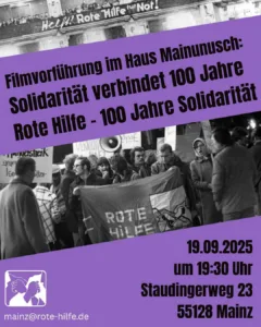 Rote Hilfe: Filmvorstellung und AusstellungVon Haus Mainusch / 19. September 2025 Wann 19. September 2025 19:30 Zum Kalender hinzufügen ICS herunterladen Google Kalender iCalendar Office 365 Outlook Live Veranstaltungstyp Vortrag
